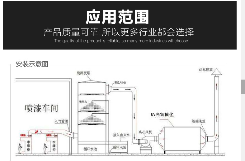 1、本产品利用的光束照射恶臭气体,裂解恶臭气体如:氨、胺、硫化氢、甲硫氢、甲硫醇、二甲二硫、二硫化碳和苯乙烯,硫化物H2S、VOC类,苯、甲苯、二甲苯的分子链结构,使或无机高分子恶臭化合物分子链,在紫外线光束照射下,降解转变成低分子化合物,如CO2H2O等。