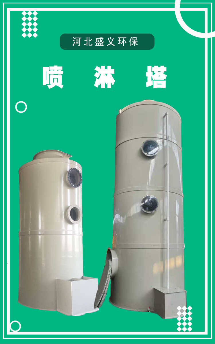 湿式喷淋洗涤塔构造与原理:使废气与水或者添加化学药剂之水溶液接触,将污染物传入水中,充填填料造成相当大的接触面提供气相于液相酸碱中和,从而达到废气净化的目的。