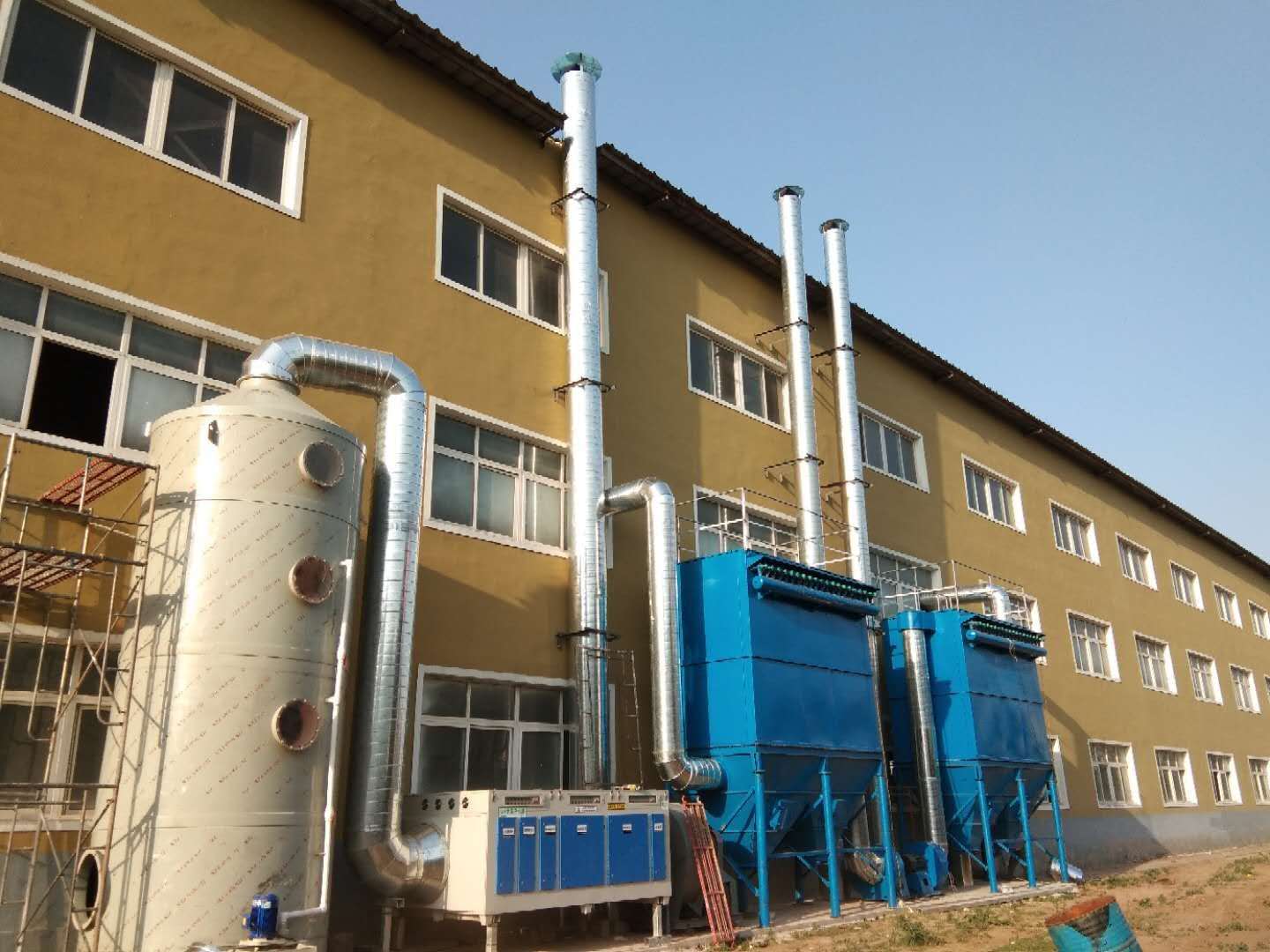 辽宁海城喷漆房安装喷淋塔,光氧净化设备,DMC-200袋单机布袋除尘器,共四台设备。